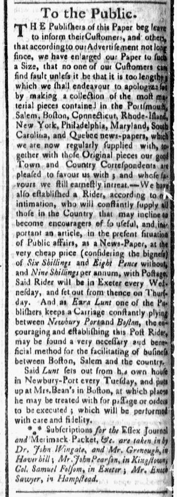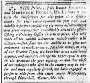 John Mycall and Henry-Walter Tinges, the printers of the Essex Journal, found themselves in a situation similar to the one that Daniel Fowle, the printer of the New-Hampshire Gazette, experienced in the fall of 1775. A disruption in Fowle’s supply of paper in Portsmouth had forced him to print his newspaper on smaller sheets on a few occasions, including the October 17 edition. Three days later, Mycall and Tinges did the same in Newburyport. Instead of four pages of three columns each, that issue had four pages of two columns each. The masthead featured plain type for the title rather than presenting “Essex Journal” in the usual scrolling script. The woodcuts that usually flanked the title, an Indigenous man with a bow and arrow on the left and a packet ship at sea on the right, did not appear at all.