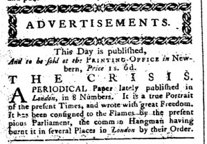 Davis used the pamphlet’s colorful history in marketing it to readers in North Carolina. “It is a true Portrait of the present Times,” he declared, “and wrote with great Freedom. It has been consigned to the Flames by the present pious Parliament, the common Hangman having burnt it in several Places in London by their Order.” York provides this overview: “The Crisis was condemned informally by leaders in the British government, and then formally in court, as a dangerous example of seditious libel [due to the depictions of George III]. Copies of it were publicly burned, and yet publication continued uninterrupted.” American Patriots had their supporters among the British public, including authors and printers who “played on shared beliefs and shared fears: beliefs in the existence of fundamental rights … and the fear that loss of those rights in Britain’s American colonies could lead to their loss in Britain itself.” York posits that the “men behind The Crisis were determined to interest the British public in American affairs and were no doubt pleased when various issues were reprinted in the colonies.” Indeed, newspapers reprinted some of the essays in their entirety. Printers also recognized opportunities to generate revenue while disseminating The Crisis to colonizers. Advertisements for individual numbers of the pamphlet peppered the pages of American newspapers in the spring and summer of 1775 as printers in several colonies distributed new issues as they came to hand. The day before Davis ran his advertisement in the North-Carolina Gazette, John Anderson announced in a notice in the New-York Journal that “on Monday will be published No. 9 of the CRISIS.” Instead of printing one issue at a time, Davis packaged the first eight issues together for readers, hoping that providing such convenient access would entice them to buy the volume.