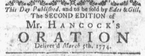 In the spring of 1771, patriots marked the first anniversary of the “BLOODY TRAGEDY” now known as the Boston Massacre with “AN ORATION Delivered … at the Request of the Inhabitants of the Town of Boston … By JAMES LOVELL.” That started an annual tradition, with Joseph Warren giving the oration in 1772, Benjamin Church in 1773, and John Hancock in 1774. Gathering for the oration became an annual ritual. So did publishing and marketing it.