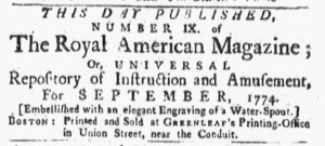 Those four newspapers each carried advertisements about the September issue of the magazine by the end of October. On October 20, Greenleaf inserted a notice in the Massachusetts Spy to inform the public that he moved his printing office to Union Street. In a nota bene, he stated, “The Magazine for September, will be out next week.” He ran the same notice in the Boston Evening-Post on October 24. A few days later, both the Massachusetts Gazette and Boston Weekly News-Letter and the Massachusetts Spy featured variant advertisements that declared, “To-Morrow will be published, THE Royal American Magazine, for September 1774.” On October 31, the Boston-Evening Post and the Boston-Gazette also ran similar, but not identical, advertisements that stated, “THIS DAY PUBLISHED … The Royal American Magazine … For SEPTEMBER 1774.” The version in the Boston Evening-Post promoted an “elegant Engraving of a Water-Spout” and directed readers to Greenleaf’s printing office. The one in the Boston-Gazette did not. Greenleaf got the word out about the latest issue of the magazine, produced incredibly quickly compared to previous issues, but did not resort to standard copy that he sent to the various newspapers in Boston.