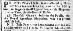 The final mention of the Royal American Magazine in newspaper advertisements published in January 1775 may not have been the kind of coverage that Joseph Greenleaf, the printer, desired. Henry Christian Geyer once again inserted his notice for printing ink that he made and sold “at his Shop near Liberty-Tree” in Boston in the January 30 edition of the Massachusetts Gazette and Boston Post-Boy. In it, he noted to the public that “the Royal American Magazine, was not printed with his Ink.”