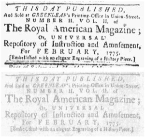 Unfortunately, my teaching schedule will not allow me to visit the reading room at the American Antiquarian Society before publishing this entry. On the other hand, I am fortunate to live and work in the same city as the research library that houses the original magazine that was digitized to make the Royal American Magazine more widely accessible. That means that I have more ready access to the original and tracking down answers to these sorts of questions than most others who consult the images in the database. I will update this entry when time allow, but leave this discussion intact since it demonstrates that even though digital surrogates expand access, they cannot replace original sources.