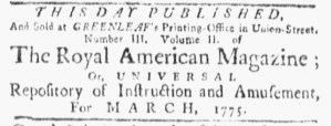 In March 1775, three of Boston’s newspapers carried advertisements that the February issue of the Royal American Magazine was now available “at Greenleaf’s Printing Office in Union-Street near the Market” in Boston. The advertisements first appeared in the Boston Evening-Post and the Boston-Gazette on March 13. Based on publication dates for magazines today, the February issue seems quite overdue, but in the eighteenth century published distributed magazines at the end of the month or early in the following month. Considering that Greenleaf had not advertised the January edition until February 20, it appears that he managed to take the next issue to press in just three weeks.