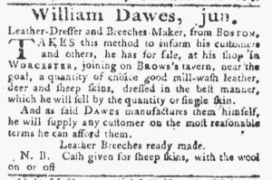 William Dawes, Jr., a “Leather-Dresser and Breeches-Maker, from BOSTON,” placed an advertisement in the January 26, 1776, edition of Thomas’s Massachusetts Spy. Just as Isaiah Thomas had moved his printing press from tumultuous Boston to the relative security of Worcester just as the Revolutionary War began, Dawes relocated to the inland town. According to his advertisement, he now ran a shop “in WORCESTER,” adjoining a tavern and near the jail. Since he was a newcomer, he could not expect that prospective customers knew his location, so he identified familiar landmarks to help them find him. He had on hand “a quantity of choice good mill-washed leather, [and] deer and sheep skins, dressed in the best manner,” selling them either individually or “by the quantity.” Dawes processed or “manufacture[d]” the leather himself, allowing him to “supply any customer on the most reasonable terms he can afford them.” To that end, he sought “sheep skins, with the wool on or off,” and offered cash to his suppliers.