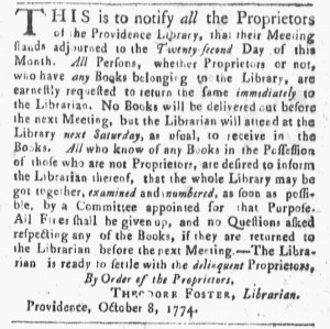 The Providence Library Company, a private subscription library, conducted some of its business in the public prints in the eighteenth century. Early in the fall of 1774, Theodore Foster, the librarian, ran an advertisement in the Providence Gazette, requesting that “All Persons … who have any Books belonging to the Library … return the same immediately” so they could be “examined and numbered.” In addition to conducting an inventory of the collection, the librarian was “ready to settle with the delinquent Proprietors” who had not paid their subscriptions.