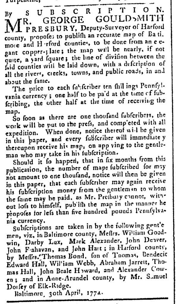 Artists and engravers also used subscriptions for publishing prints, as did surveyors for maps. George Gouldsmith Presbury, “Deputy-Surveyor of Harford county” in Maryland, published subscription proposals for “an accurate map of Baltimore and Harford counties” in the Maryland Journal, Baltimore’s first newspaper, in 1774. That the surveyor envisioned a market for this map testified to the growing significance of Baltimore on the eve of the American Revolution. The map “will be nearly, if not quite, a yard square” and feature “a description of all the rivers, creeks, town, and public roads.” Presbury needed commitments from “one thousand subscribers” before “the work will be put to press.” To aid in the endeavor, more than a dozen local agents in Baltimore, Harford, and Anne Arundel Counties accepted subscriptions and deposits. Upon publication, Presbury would advertise in the Maryland Journal once again, calling on subscribers to collect their maps form the local agents who accepted their subscriptions.
