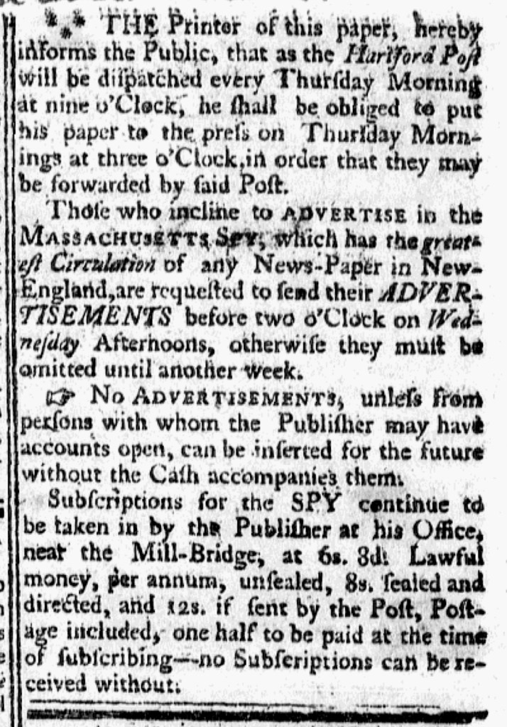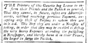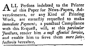 Historians have often asserted that printers extended credit for subscriptions while requiring advertisers to pay in advance, recognizing advertising as the more significant revenue stream. Throughout the colonies, many printers did frequent place notices asking, cajoling, and even threatening legal action in their effort to get subscribers to pay. However, many also specified that subscribers were supposed to pay for half the year “upon entering.” Difficult times forced Purdie to make that a condition for new subscribers. He also seems to have extended credit for advertisements, though his notice did not make clear whether he meant newspaper notices or job printing (like handbills and broadsides) or both. Even as printers followed standard practices, how they actually applied them varied from printing office to printing office.