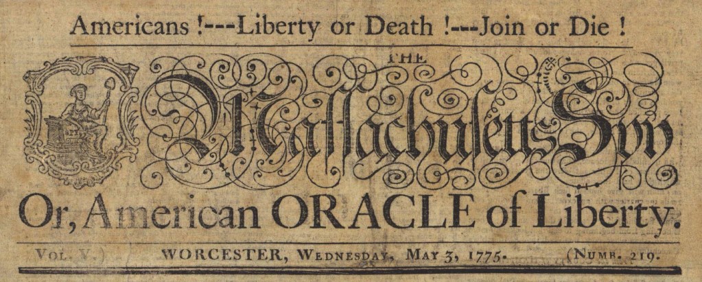 When the patriot printer Isaiah Thomas revived the Massachusetts Spy, originally published in Boston, after fleeing to Worcester to evade “friends of the British administration” who “openly threatened him with the effects of their resentment,” the first issue published in that town opened with a notice to the public.[1] He reminded readers that he had previously entered into an agreement to aid in establishing a press in Worcester, installing a junior partner to manage a printing office there while he oversaw the enterprise from Boston. He had issued proposals for the newspaper, intending to name it the “WORCESTER GAZETTE, or AMERICAN ORACLE of LIBERTY.” However, when Thomas determined that it became “highly necessary that I should remove my Printing Materials from Boston to this Place,” he decided to “continue the Publication of the well-known MASSACHUSETTS SPY, or THOMAS’S BOSTON JOURNAL.” He continued the numbering but gave it a new title, combining elements of the existing one and the proposed one: Massachusetts Spy Or, American Oracle of Liberty. In addition, the masthead proclaimed, “Americans! — Liberty or Death! — Join or Die!”