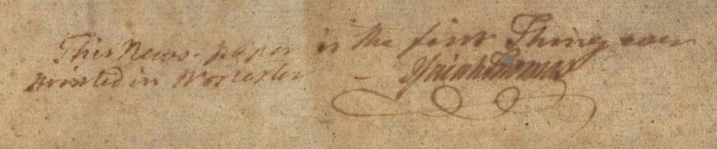 In his notice, Thomas reported that first he sent his “Printing Utensils” to Worcester and then “escaped myself from Boston on the memorable 19th of April, 1775, which will be remembered in the future as the Anniversary of the BATTLE of LEXINGTON!” Elsewhere that first issue published in Worcester, Thomas provided a chronicle of the battle “collected from those whose veracity is unquestioned.” That narrative likely incorporated elements drawn from the printer’s own firsthand account. Several years later, he recorded that at daybreak on April 19 he “crossed from Boston over to Charlestown in a boat with Dr. Joseph Warren, went to Lexington, and joined the provincial militia in opposing the king’s troops.”[2] The following day, went to Worcester to open the printing office and revive his newspaper. He was proud of that work and the service he provided, making a note and signing his name in the margin at the bottom of the first page of the first issue published there: “This News-paper is the first Thing ever printed in Worcester – Isaiah Thomas.”