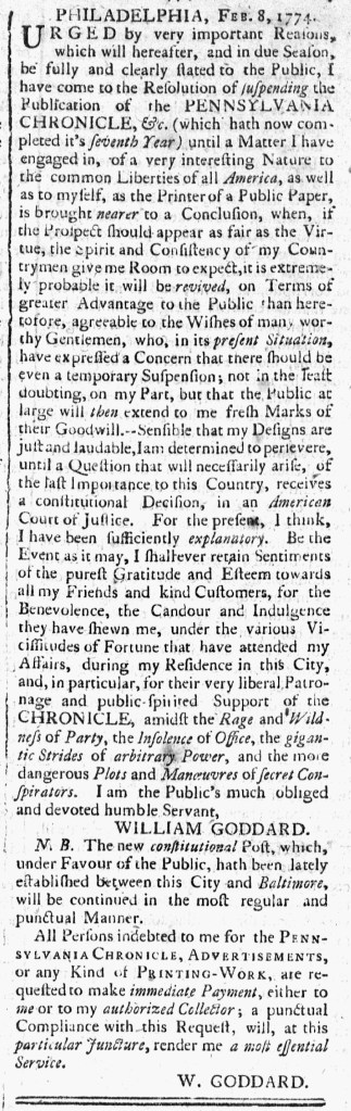 “I have come to the Resolution of suspending the Publication of the PENNSYLVANIA CHRONICLE.”