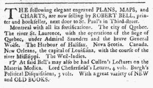 The book itself became a vehicle for distributing additional advertising. Printers and booksellers frequently inserted their own advertisements in books, pamphlets, and almanacs, yet that was not the case with this medical treatise. Instead, it featured an advertisement from a medical practitioner that resonated with the contents of the book. After the treatise and appendix, a full-page advertisement informed readers that “SPLINTS FOR FRACTURES, OF THE LEG AND THIGH, MADE IN IMMITATION OF MR. SHARP’S, WITH MR. POT’S BANDAGES FOR THE SAME, ARE SOLD BY DONALD M ‘LEAN, APOTHECARY AND DRUGGIST, FIVE DOORS FROM THE COFFEE-HOUSE, IN NEW YORK.” Two lines of fleurettes, one above and below, adorned the advertisement. Today, readers expect to encounter promotions for books and related products incorporated into books by publishers, yet that marketing strategy was not invented by the modern publishing industry. Instead, it dates to the eighteenth century and earlier as printers, booksellers, and other entrepreneurs devised many kinds of advertising media. The Adverts 250 Project focused primarily on advertisements that appeared in eighteenth-century newspapers for several reasons, including their abundance and frequency, yet early Americans encountered many forms of advertising, including broadsides, billheads, catalogs, trade cards, and advertisements inserted in books.