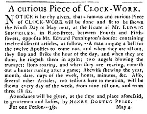 The complex piece of machinery featured various figures, including a “man ringing a bell for the twelve Apostles to come out, and when they are all out, they stop and strike the hour of the day, and when they are done, he ringeth them in again.” If that was not to delight viewers, the clockwork also had “two angels blowing the trumpet” as well as “lions roaring, and when they are roaring, cometh out a hunter running after a game.” The animals that the hunter chased showed “the year, month, date, days of the week, hours, minutes,” and more. Prize did not wish to reveal all the surprises that were part of the experience of viewing the clockwork. Instead, he promised “several other Articles, too tedious to mention,” though his advertisement suggested that those figures were not “tedious” at all. Readers had to see them to satisfy their curiosity.