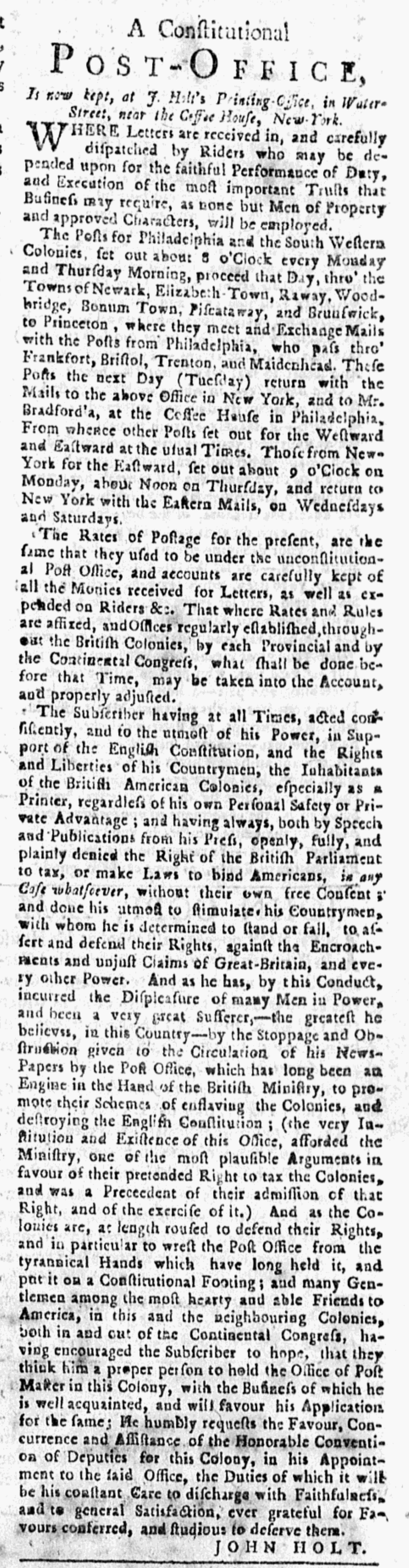 Yet Whetcroft used his advertisement to relay more than just the logistical details. He gave an overview of the purpose that the Constitutional Post Office served as the imperial crisis intensified, hostilities commenced, and some colonizers considered whether they should declare independence rather than continue seeking redress of their grievances against Parliament. “The constitutional office having been instituted by the congress,” the postmaster explained, “for the security and ready conveyance of letters, and all kinds of intelligence through this continent; and as the same has been attended with a great expence, it is not doubted that all well-wishers to the present laudable opposition in America, will promote the same, by sending and procuring to be sent all letters, packages, &c. to the constitutional post-office.” Supporters of the American cause had a civic duty, Whetcroft asserted, to make use of this service.