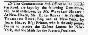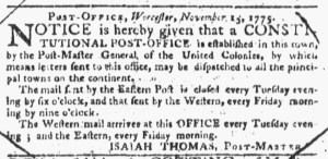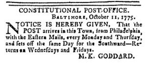 Frederick Green, the printer of the Maryland Gazette, gave Whetcroft’s notice a privileged place the first time it appeared in that newspaper. It appeared as the second advertisement following the news, preceded only by Green’s own advertisement for the almanac he just published and sold at the printing office. As much as Green may have been a supporter of the Constitutional Post Office, he still had to earn his livelihood with his own endeavors! Still, the printer had room for only two advertisements at the bottom of the final column on the second page. He could have chosen from among several of a similar length to Whetcroft’s advertisement, yet he selected the notice about the Constitutional Post Office to appear alongside news of the revolutionary events taking place in Maryland and beyond. In subsequent editions, that advertisement ran intermingled among others, but that was common practice for notices that printers initially gave privileged places the first time they ran in their newspapers.