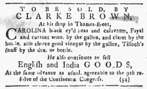 An advertisement that Clarke Brown first placed in the Newport Mercury on January 16, 1775, a little over six weeks after the Continental Association went into effect, ran for several months. It appeared once again on May 1, just two weeks after the battles at Lexington and Concord. In it, Browne promoted several commodities, including peas, wine, and snuff, and advised the public that he “continues to sell English and India GOODS.” He very carefully clarified that he set prices for those imported wares “At the same advance as usual, agreeable to the 9th resolve of the Continental Congress.”