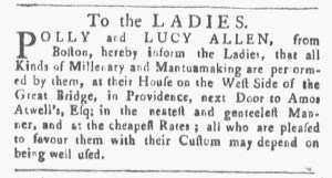 When William Barton, a hatter in Providence, “entered into the American Army” in 1775, he ran a newspaper advertisement that delegated responsibilities to his wife and a business associate. He requested that “all Persons to indebted to him … make immediate Payment to his Wife, … who is legally impowered to give proper Acquittances, that he may be enabled to discharge his just Debts.” It may not have been the first time that his unnamed wife oversaw accounts for the Barton household and her husband’s shop. Like many other wives of shopkeepers and artisans, she could have had experience assisting her husband by tending to customers while he was busy or away from the shop. She did not, however, assume responsibility for making sales during her husband’s extended absence while he served in the Continental Army, at least not initially.