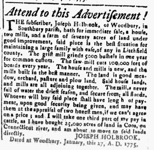 When Joseph Holbrook sought to sell a house, two mills, and a farm in Woodbury in the winter of 1775, he placed an advertisement in the Connecticut Journal and New-Haven Post-Boy. In it, he assured prospective purchasers that “said place is the best situation for maintaining a large family with ease.” The house and mills were new. The gristmill “grinds 5000 bushels in one year for common custom,” while the sawmill “cuts 100,000 feet of boards every year.” They operated throughout the year because the mills “never fail of water [during] the driest season,” nor did they flood at other times. The land included “good meadow, orchard, pasture and plow land.”