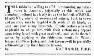 Nathaniel Pike testified that he wished to do his part to support the American cause in an advertisement in the July 14, 1774, edition of Rivington’s New-York Gazetteer. He informed the public that he was “willing to assist in promoting manufacturers in America, (especially at this critical and alarming juncture)” and, accordingly, “lately set up the business of REED-MAKING.” Eighteenth-century readers familiar with weaving knew that reeds were the “part of a loom consisting of a set of evenly spaced wires known as dents (originally slender pieces of reed or cane) fastened between two parallel horizontal bars used for separating, or determining the spacing between, the warp threads, and for beating the weft into place.”[1] Pike pledged that “weavers and others, both in town and country, may be supplied with reeds of all kinds, as neat and good as any imported.”