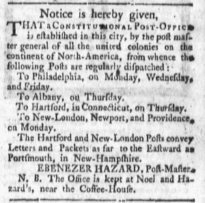 On November 27, “sudden danger and confusion” did indeed occur at James Rivington’s printing office on Hanover Square. Angry with the Tory perspective that Rivington often expressed in his newspaper, the Sons of Liberty attacked his printing office. It was not the first time, but the damage was much more significant than the previous attack. The Sons of Liberty destroyed Rivington’s press and type, preventing him from continuing to publish his newspaper or anything else. The printer decided to leave the city, sailing for London. He returned in 1777, during the British occupation of New York, and established Rivington’s New-York Gazette. It continued the numbering of Rivington’s New-York Gazetteer. That tile lasted for only two issues before he updated it to Rivington’s New York Loyal Gazette for several weeks and then the Royal Gazette throughout the remainder of the war. Rivington’s newspaper changed names one more time, becoming Rivington’s New-York Gazette for just over a month before ceasing publication with the December 31, 1783, edition. In his History of Printing in America (1810), patriot printer Isaiah Thomas noted that “for some time Rivington conducted his paper with as much impartiality as most of the editors of that period.”[1] Adhering to that impartiality longer than other printers contributed to the perception that Rivington favored Tory sentiments when he claimed that he merely exercised freedom of the press. Earlier in 1775, he advertised “Pamphlets published on both sides, in the unhappy dispute with Great-Britain.” In addition to the Longs’ advertisement about their boarding school, the final issue of Rivington’s New-York Gazetteer also carried an advertisement for the Constitutional Post Office in New York. The Second Continental Congress authorized the Constitutional Post as an alternative to the imperial system.