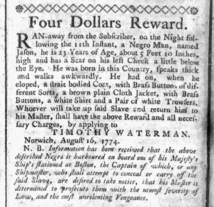 One such advertisement appeared as summer turned to fall in 1774. Jason, an enslaved man “born in this Country,” departed sometime during the night of August 11. Timothy Waterman of Norwich spent a few days trying to find Jason on his before resorting to a newspaper advertisement dated August 16. It first ran in the August 18 edition of the Norwich Packet and appeared again on August 25. For its third iteration in the weekly newspaper, Waterman’s notice included a nota bene with an update: “Information has been received that the above described Negro is harboured on board one of his Majesty’s Ship’s stationed at Boston.” Waterman did not reveal the source of this information. Perhaps his advertisement and its dissemination far beyond Norwich yielded this lead. Waterman warned the captain of that vessel “or any Shipmaster” that should they “attempt to conceal or carry off said slave … that his Master is determined to prosecute them with the utmost severity of Law, and the most unrelenting Vengeance.” He sought to combine the power of the press and the power of the state in his effort to retrieve Jason and return him to enslavement.