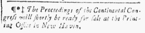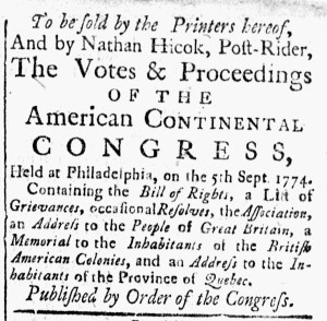 Throughout the colonies, printers provided updates from the First Continental Congress during its meeting in September and October 1774. After the delegates adjourned and traveled home, printers quickly set about publishing, advertising, distributing, and selling a pamphlet that included an overview of the “Votes & Proceedings” as well as “the Bill of Rights, a List of Grievances, occasional Resolves, the Association, an Address to the People of Great Britain, a Memorial to the Inhabitants of the British American Colonies, and an Address to the Inhabitants of the Province of Quebec.” William Bradford and Thomas Bradford, printers of the Pennsylvania Journal, first made the pamphlet available in Philadelphia just a week after the meeting ended. Other printers soon joined them, producing their own local editions.