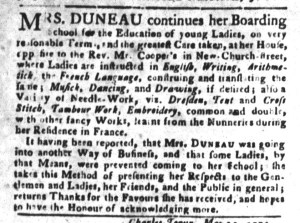 “MRS. DUNEAU continues her Boarding School for the Education of young Ladies.”