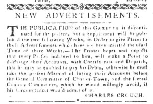 Even though Crouch hoped to resume publishing the South-Carolina Gazette and Country Journal, he did not have the opportunity.  In late August 1775, he boarded a vessel headed to Philadelphia.  He sought supplies for his printing office, especially paper that had grown scarce.  The ship was lost at sea.  Thomas stated that Crouch’s widow published the newspaper for a short time, but Salley clarifies that Ann Crouch “revived her husband’s paper under the name of The Charlestown Gazette” in 1778 and “conducted it until the capture of Charles Town by the British in 1780.”[4]  A few issues have survived and been digitized for greater access by scholars and the public.  The Adverts 250 Project will examine those at the appropriate time.  For now, the demise of the South-Carolina Gazette and Country Journalcertainly had ramifications in Charleston and beyond.  In August 1775, readers in South Carolina had one less source of news and one less publication for disseminating advertisements.