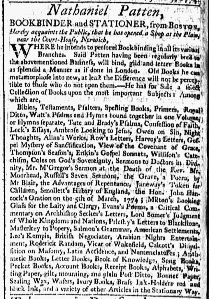 For some readers, the border for Patten’s advertisement may have evoked a highboy chest or other large piece of furniture. It may even have been intended as a bookcase and secretary desk that would have held the various books and stationery listed within the border. For the lower portion, the left, right, and bottom of the border were composed of a single line of decorative type, just like the borders in the other advertisements, while in the upper portion the left and right sides had three lines of even more intricate type. Those sides rose into an arch composed of other kinds of detailed printing ornaments. The compositor even created five finials, one each on the left and right at the bottom of the arch and three clustered together at the top. The year, 1774, appeared within a pendant inside the arch, much like a piece of furniture would have an engraving. If the type remained set into the new year, Patten had the option to update the date. The advertisement was massive, filling almost an entire column on the final page of the November 17, 1774, edition. The first time that it appeared, it ran on the first page on November 3, that time occupying an entire column because of the amount of space required for the masthead. The border appeared heavy, giving Patten’s advertisement more weight compared to others in the Norwich Packet. The finished product does not reveal how closely Patten worked with the compositor in designing or approving the border. Whatever the case, he almost certainly paid extra for it.
