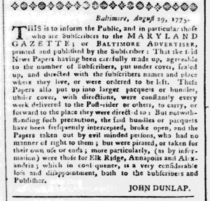 Something went wrong. John Dunlap, the printer of Dunlap’s Maryland Gazette, had a system for delivering his newspaper to subscribers who lived outside of Baltimore, but “evil minded persons” interfered with it. In particular, disruptions occurred in Annapolis and Elk Ridge, both in Maryland, and Alexandria, Virginia. That prompted Dunlap to run a notice in the August 29, 1775, edition, placing it immediately after local news and first among the advertisements to increase the likelihood that readers would see it.