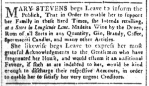 “In Order to enable her to support her Family in these hard Time, she intends retailing … Gin, Brandy, Coffee.”