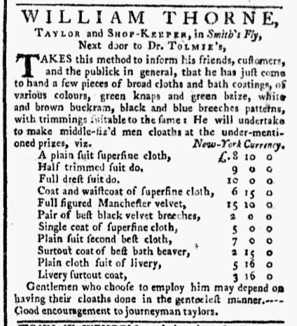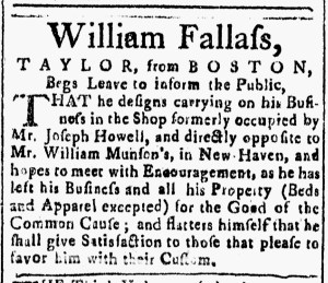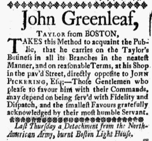 When Edward Davis placed an advertisement in the Connecticut Gazette in December 1775, it looked much like advertisements that other tailors ran in newspapers throughout the colonies. He stated that he “performs in the neatest and genteelest Manner, and at the most reasonable Prices, all kinds of Work.” In just a few words, he emphasized his skill and made appeals to quality, fashion, and price. “Any Gentlemen who are disposed to honour him with their Commands,” Davis declared, “he will faithfully serve and with the utmost Punctuality; and will with Gratitude acknowledge the smallest Favours conferr’d on their most obedient Servant.” Those overtures promising exemplary customer service echoed advertisements placed by many other shopkeepers and artisans.