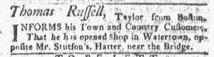 Yet Davis’s notice also contained some distinctive features that resonated with current events. He introduced himself as a “TAYLOR from BOSTON” who “Has taken a Shop in the Parish of Scotland, in Windham, near the Meeting House.” Newcomers often used newspaper advertisements to introduce themselves when they moved to a new town, hoping to attract the attention of prospective customers. At other times, Davis’s previous experience in Boston would have supported his claim to make garment in the “genteelest Manner,” bringing the styles of the bustling urban port to the countryside. In this instance, however, noting that he came “from BOSTON” might have signaled that he was a refugee who departed the city during the exchange negotiated by General Thomas Gage and the Sons of Liberty after the battles at Lexington and Concord. At the time Davis ran his advertisement, the siege continued. In Connecticut and Rhode Island, the frequency of advertisers describing themselves as “from BOSTON” seemed to increase, likely reflecting decisions made by many residents to leave when they had the chance. After all, they had already experienced the distresses that ensued when Parliament passed the Boston Port Act to close the harbor until colonizers made restitution for the tea destroyed in December 1773. Davis made another nod to the war that began the previous April. In addition to “Plain” clothing, he also made items in the “Regimental Way” to outfit soldiers and officers. At a glance, his advertisement looked like so many others placed by tailors, but on closer inspection it testified to the times and the transition from imperial crisis to warfare.