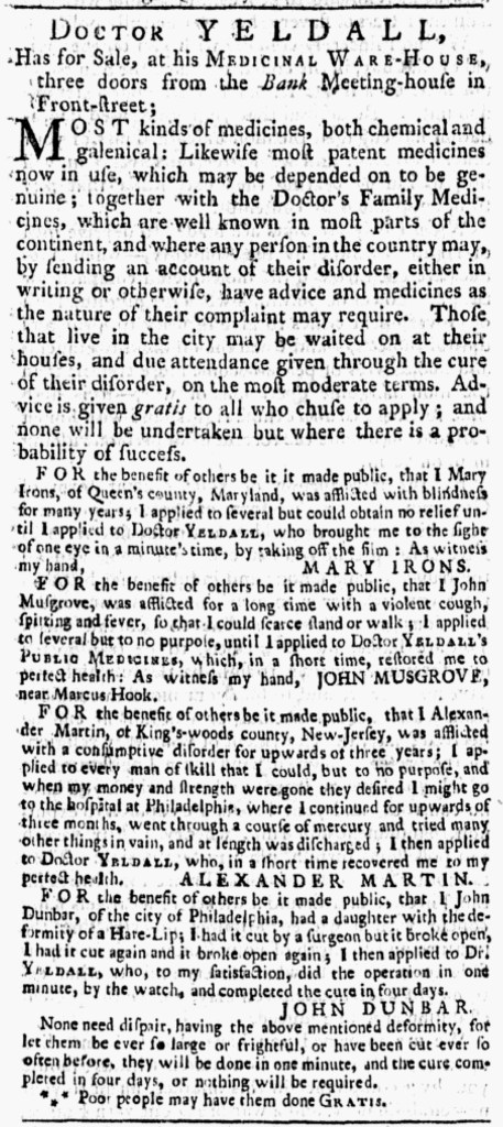 Doctor Yeldall apparently believed that testimonials worked. In June 1775, he published an advertisement that included several testimonials from his patients. Three months later, he once again promoted his “MEDICINAL WARE-HOUSE’ in Philadelphia with an advertisement that featured three new testimonials. The notice gave the impression that the doctor had not solicited them, but instead merely published letters addressed “To Dr. YELDALL in Front-Street, Philadelphia” at the request of those who sent them. “For the benefit of others I hope you will make the following public,” Nathan Agnomall’s testimonial began. Similarly, John Campbell, who had suffered “dreadful ulcers in one of my leges,” implored the doctor: “I beg you may make it public, for the benefit of others labouring under the same calamity” that Yeldall’s medicines healed leg.