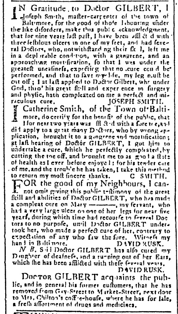 In his preamble to the testimonials, Yeldall described his “Doctor’s Family Medicines” as “so well known and approved of throughout most parts of the continent.” Two of the testimonials did indeed come from beyond Philadelphia. Campell listed his address as “Eversham, Burlington county,” in New Jersey, while Agnomall stated that he was “living in New-Haven, in Connecticut.” The third testimonial, however, came from a resident of Philadelphia, George Smith, “living in Third-street, near Vine-street.” Skeptics in that city could question the veracity of letters that supposedly arrived from other colonies, but they might know Smith or could seek him out to confirm what they saw printed in the newspaper advertisement. Smith’s letter even revealed that he had been cured of a “consumptive disorder” and “to the surprise of myself and neighbours, found myself recovered to health.” Many residents of Philadelphia living in Smith’s neighborhood could also testify to the efficacy of the Yeldall’s medicines, at least that was the inference in Smith’s letter. Unlikely to attempt to track down Smith or interview any of his neighbors, prospective patients who had not found relief through any other means may have found this testimonial convincing enough to give Yeldall’s medicines a chance. Even if they had doubts, the details in Smith’s letter gave them hope by encouraging them to believe something that was likely too good to be true.