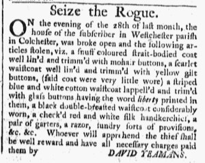 John Holbrook of Pomfret intended to attract attention with the headline for his advertisement: “SEIZE the ROGUE!” Holbrook explained that a “noted thief” had stolen various items from his house during the night of April 28, 1775. He described “a large silver WATCH with a silver-twist chain, a clarat colour’d coat lately let out at the sides and at the outsides of the sleeves, a jacket near the same colour, both of them lined, … [and] a psalm book with the names of Asa Sharper and Caleb Sharpe in it,” along with other pilfered items. Holbrook offered a reward to “Whoever brings said villain … with the above articles” or a smaller reward for just “the said thief without the articles.” Given the amount of time that had passed, there was a good chance that the thief had fenced or sold the stolen items, giving some colonizers greater access to consumer culture through what Serena Zabin has termed an informal economy. Whatever the fate of the watch, coat, and psalm book, Holbrook used a lively headline to increase the chances that readers would take note of his advertisement. He did so at a time that editors and others employed in printing offices did not yet craft headlines for most of the news they published.