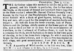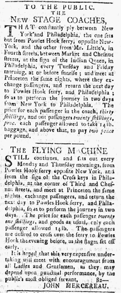 When it came to stagecoaches that connected New and York and Philadelphia at the beginning of the American Revolution, travelers had more than one option. One line, the “NEW STAGE COACHES,” left the Powles Hook ferry, on the New Jersey side of the Hudson River “opposite New-York,” and “the sign of the Indian Queen” in Philadelphia on Tuesday and Friday mornings at sunrise. They met at Princeton in the evening, exchanged passengers, and returned to their respective points of departure the next day. Another line, the “FLYING MACHINE,” followed a similar route, one stagecoach leaving from Powles Hook ferry and the other from the “sign of the Cross keys” in Philadelphia. They also met in Princeton, exchanged passengers, and completed the journey in two days. That did not, however, include crossing the Hudson River. John Mercereau instructed passengers departing from New York that they should “cross over the ferry to Powles Hook the evening before, as the stages set off early.” With coaches departing from each city four mornings each week, customers could choose which line best fit their schedules.