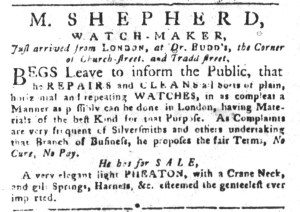 Realizing that the Connecticut Courant circulated far beyond Hartford, Hilldrup took the opportunity to address “Gentlemen in the army, or others at a distance.” Like other watchmakers, he provided mail order services for cleaning and repairs. He promised those clients that by “forwarding their commands by any of the post-riders” they “may depend on fidelity and dispatch.” As the Continental Army continued the siege of Boston, Hilldrup may have known that some of the clients he served in recent years too part in that endeavor. In an unfamiliar place that experienced some of the most significant disruptions during the first year of the Revolutionary War, they may have been at a loss to identify local artisans that they trusted to do repairs and perform routine maintenance. That might have made Hilldrup’s mail order service look especially attractive. The watchmaker likely also hoped that others enlisted in the army (as well as “others at a distance”) who had not previously availed themselves of his services would be influenced by his claim that he already established a robust clientele, those “many favours received of the indulgent public” that he invoked at the beginning of his advertisement. Whether or not this strategy proved effective, Hilldrup envisioned “Gentlemen in the army” as a new category of customers to target in his marketing. The Revolutionary War presented opportunities to savvy entrepreneurs as well as challenges and disruptions.