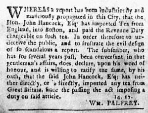 “John Hancock, Esq; has neither directly, or indirectly, imported any tea from Great Britain.”